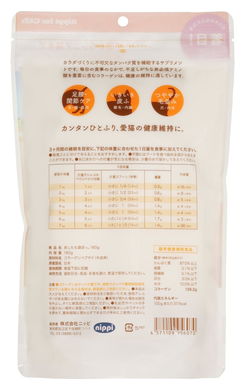 あしたも遊ぼっ。ねこちゃんの足腰・皮膚・毛並み想いのコラーゲンは、猫ちゃんの健康維持に必要な成分をバランスよく配合した、総合的にサポートする猫用コラーゲンサプリメントです。