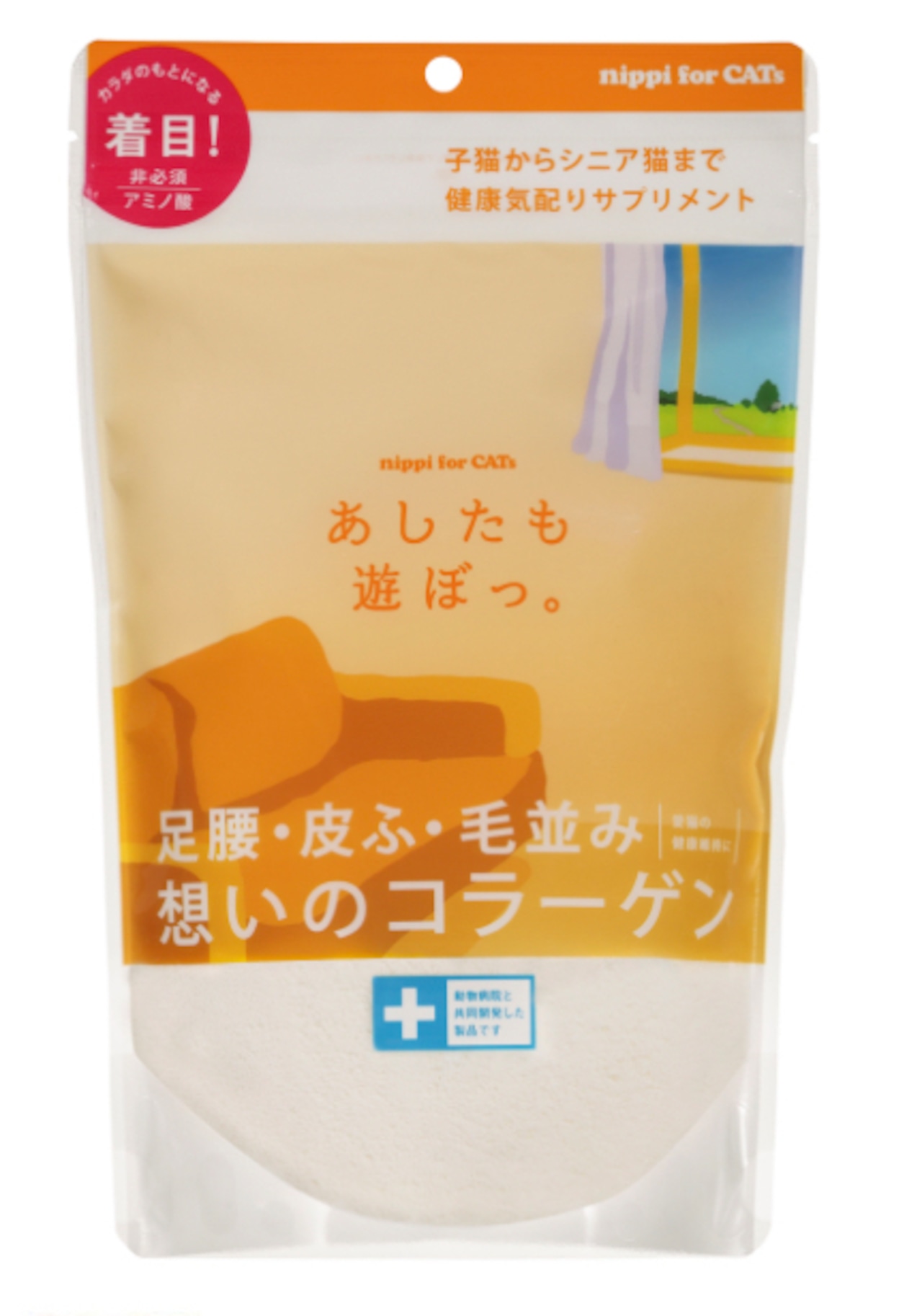 あしたも遊ぼっ。ねこちゃんの足腰・皮膚・毛並み想いのコラーゲンは、猫ちゃんの健康維持に必要な成分をバランスよく配合した、総合的にサポートする猫用コラーゲンサプリメントです。
